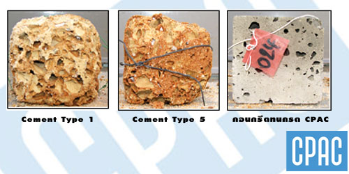 ซึ่งจากส่วนหนึ่งของการทดลองในห้องปฎิบัติการของ CPAC ได้ทำการทดลองโดยการหล่อคอนกรีตส่วนผสมต่างๆ แล้วนำไปแช่กรด Acetic เข้มข้น มีค่า pH ประมาณ 3.0 ทำการแช่กรดนาน 6 เดือน พบว่าคอนกรีตมีความเสียหายทางกายภาพอย่างชัดเจน จึงตอบคำถามข้อนี้ได้เป็นอย่างดีว่า ในขณะนี้ยังไม่มีคอนกรีตชนิดใดที่สามารถต้านทานการกัดกร่อนของกรดได้ โดยที่ไม่เกิดความเสียหายกับคอนกรีตเลย จะมีก็เพียงแต่คอนกรีตที่สามารถยืดอายุของคอนกรีตที่ต้องสัมผัสกับกรดให้ยาวนานยิ่งขึ้นจากเดิมเท่านั้น